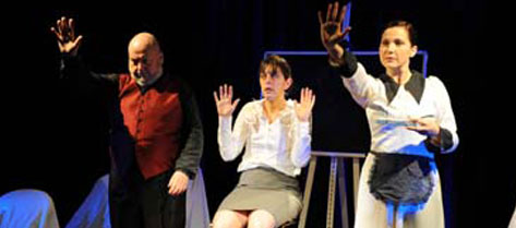 roter Handschuh symbolisierte die Ehefrau, Doktorhut und Brille die Doktoren. Fast könnte dieses Wechselspiel verwirrend wirken, doch die Schauspieler fanden sich mit Lust in das Hin und Her und nahmen den Zuschauer gefangen. Und da der Rollentausch vor den Augen des Publikums stattfand, blieben die Vorgänge auch transparent.